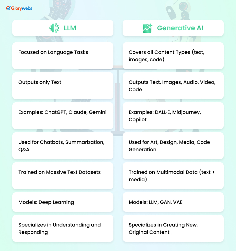 Quick Summary: As artificial intelligence advances, distinguishing LLM vs Generative AI becomes increasingly important. Although both are revolutionary technologies, their purposes, structures, and applications vary greatly. Large Language Models (LLMs) specialize in processing and generating text, while Generative AI encompasses a broader range of content types, including images, music, and videos. Understanding their unique features and differences can help businesses, developers, and researchers leverage the right tools for their needs. This guide will explore all key aspects in a structured, easy-to-follow manner. Table of Content Introduction Understanding LLM vs Generative AI LLM vs Generative AI Comparison Table Differences Between Generative AI and LLM 1. Output Types 2. Training Focus 3. Applications and Use Cases 4. Examples How LLMs Are a Part of the Generative AI Ecosystem Real-World Applications – Generative AI vs LLM Future Trends – LLMs vs Generative AI Conclusion FAQs Introduction The debate between LLM vs Generative AI has gained momentum as AI becomes a central force in technology innovation. While both concepts involve machine learning, their core objectives and capabilities differ. LLMs are designed to understand and generate human-like text based on vast datasets. In contrast, Generative AI covers a broader creative spectrum, producing text, images, videos, and more. This blog dives deep into the evolving roles of these technologies and highlights their growing significance in multiple industries. Understanding LLM vs Generative AI Artificial intelligence has expanded into specialized areas, increasing the importance of understanding LLM vs Generative AI. While both rely on deep learning techniques, their functionality and scope differ. LLMs primarily handle language-based tasks, whereas Generative AI extends beyond language to create visual art, music, and simulations. Recognizing these fundamental differences is critical for anyone looking to apply AI technologies strategically across industries or research projects. Features of LLM Language Understanding and Generation: LLMs are engineered to comprehend complex sentence structures, nuances, and context, allowing them to generate human-like text for conversations, creative writing, and professional content creation tasks. Contextual Awareness: They maintain continuity across long conversations by remembering earlier inputs, enabling interactions that feel coherent, logical, and highly relevant to user queries or evolving dialogue scenarios. Transformer-Based Architecture: LLMs are built on transformer models, which allow them to capture intricate patterns within language, handle long-sequence data efficiently, and deliver highly accurate predictions across various input formats. Knowledge Retention Across Subjects: Training on extensive and diverse datasets enables LLMs to retain knowledge from multiple disciplines, empowering them to assist in academic research, technical consulting, and broad informational tasks. Scalability and Adaptability: LLMs can be fine-tuned or adapted to industry-specific needs, making them highly scalable solutions for healthcare, finance, education, and customer service through AI automation. Advantages of LLM Enhanced Language Capabilities: LLMs deliver high-quality, human-like language output, making them ideal for tasks like drafting content, answering queries, translating text, and improving customer communication at scale. Versatility Across Industries: They can be adapted to serve various industries, including healthcare, finance, legal, and education, supporting specialized tasks such as document analysis, patient communication, and legal research. Continuous Learning Potential: Through fine-tuning and incremental training, LLMs can evolve and improve their performance, staying updated with new information and domain-specific developments, a key aspect of AI development. Reduction in Operational Costs: Implementing LLMs can automate repetitive text-based tasks, reducing the need for human resources in customer support, content creation, and knowledge management operations. Improved Decision-Making Support: By quickly analyzing vast amounts of text data, LLMs can assist businesses and researchers in extracting insights, identifying trends, and making more informed strategic decisions. Disadvantages of LLM High Computational Requirements: Training and running LLMs demand significant computational power, often requiring specialized hardware and leading to increased energy consumption and business operational costs. Data Bias and Ethical Concerns: Since LLMs learn from publicly available data, they can inherit biases, inaccuracies, or stereotypes, posing ethical challenges in sensitive applications like hiring, healthcare, and legal advising. Limited Real-World Understanding: LLMs generate content based on patterns in data but lack proper comprehension or real-world experience, which can sometimes lead to plausible yet incorrect or misleading outputs. Difficulty in Fine-Tuning: Customizing an LLM for specific tasks or industries requires expert intervention, time, and resources, making fine-tuning a complex and costly process for organizations. Potential for Misinformation Generation: Without proper safeguards, LLMs can produce misleading or factually incorrect content, especially in critical fields like medical information, financial advice, or legal documentation. Features of Generative AI Multimodal Content Creation: Generative AI models can produce various outputs, including text, images, music, videos, and even 3D models, offering broad creative possibilities across different industries. Creative Problem Solving: These systems generate novel ideas, designs, and solutions that may not exist in their training data, enabling innovation in art, architecture, game development, and marketing. Self-Supervised Learning: Generative AI models often rely on self-supervised or unsupervi