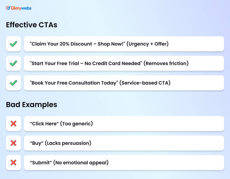 Quick Overview: Imagine you’re searching for a financial planner on Google. At the top of the results, you spot one or two CPAs marked with a small bold “Sponsored” tag. Each features a headline, a brief description, and a link. In search engine marketing (SEM), these are text ads—no images, just words. And if you’re running them, the copy you write is crucial to capturing attention and driving clicks. Search Engine Marketing (SEM) has become a cornerstone of digital advertising, and at the heart of every marketing campaign is a compelling ad copy. SEM ad copy refers to text that appears in paid search ads found on Google Ads and others. Well-crafted SEM ad copy can significantly impact your ad’s click-through rate (CTR), conversion rates, and overall ROI. In this blog, we will discuss how vital an SEM ad text is and the key components of an effective ad, and we will provide actionable tips to help you write compelling, high-converting SEM ads. Table of Content Introduction: What is SEM AD Copy Understanding the Basics of SEM Ad Text Key Aspects of an Effective SEM Copy SEM Copy Optimization: Advanced Strategies Understanding Good vs. Bad SEM Ad Copy Common Mistakes to Avoid in SEM Ad Text Why Choose Glorywebs as Your Search Engine Marketing Consultant? Final Thoughts FAQs Introduction: What is SEM AD Copy An SEM ad copy is a text advertisement appearing on SERPs. It can be written to focus on a specific product or service, with a call-to-action asking the searcher to click the ad and be taken to the advertiser’s website. SEM ad copy refers to the text used in these paid search ads, including the headline, description, and a call-to-action (CTA). The primary goal of this text is to entice users to click on the ad, visit your website, and take action (whether it’s for buying, signing up for a newsletter, or filling out a contact form). SEM ad text refers to the words that appear in paid search ads on Google Ads and other platforms. Well-crafted SEM ad copy can significantly impact your ad’s click-through rate (CTR), conversion rates, and overall ROI. A compelling SEM ad text should be relevant, clear, and persuasive. The right mix of language, targeting, and urgency can significantly impact your campaign’s success. Let’s go in-depth into what makes up SEM ad copy and how to optimize each element for maximum effectiveness. Understanding the Basics of SEM Ad Text Creating the copy for an effective SEM ad requires understanding its structure, components, and how every part intertwines to catch the user’s attention and lead to action. A well-structured SEM ad follows a clear format that aligns with search engine guidelines and appeals to potential customers. Even though the exact format may differ from one advertising platform to another, such as (Google Ads, Bing Ads, etc.), the core components remain the same. Here’s a deeper look at SEM Ad text and how to optimize it for better ad performance. 1. Headline – The Attention Grabber The headline of your SEM ad is the most important. The first thing the user notices in the search results list is your headline, which plays a pivotal role in deciding whether or not to click that ad or scroll past it. How to Write an Effective SEM Ad Headline Be Concise & Impactful: Search engines limit the number of characters you can use in a headline of your sem text (Google Ads allows three headlines of up to 30 characters each). Keep it short, snappy, and clear while ensuring it delivers value. Use Target Keywords Strategically: Incorporate your primary keyword in the headline to increase relevance and match the user’s search intent. This can improve ad rank and Quality Score, making your ad more likely to appear for relevant queries. Highlight the Key Benefit: Users want to know what’s in it. Instead of mentioning your product, emphasize how it solves a problem or adds value. Use Numbers & Symbols: If relevant, add numbers (such as “50% Off,” “Only $9.99”) or symbols (™, ®, &) to make your ad more attention-grabbing. Create a Sense of Urgency: Adding urgency will prompt action. For example, phrases like “Limited Time Offer,” “Only a Few Left,” or “Act Now” will make the user click on the link instead of waiting. Examples of Strong SEM Ad Headlines: ✅ “Increase Website Traffic – Try Our SEO Tools Free” (Value-driven) ✅ “50% Off Running Shoes – Sale Ends Soon” (Urgency + Offer) ✅ “Get the Best Web Hosting – Plans Start at $2.99” (Price Transparency) Bad Examples: ❌ “Check Out Our Services” (Too vague and lacks appeal) ❌ “Buy Shoes Online” (Lacks specificity and uniqueness) 2. Description – Inform, Persuade, and Sell The description provides additional details about your product, service, or offer. It explains the headline by elaborating on the value proposition and giving users a reason to engage with your ad. How to Optimize Your SEM Ad Description Clarify Your Offering: Clearly state what you’re selling and why it’s beneficial. Remove unnecessary fluff and get down to the point. Differentiate Yourself: Highlight what makes your business stand out. Mention unique selling points (USPs) like “Free Shipping,” “24/7 Support,” or “Money-Back Guarantee.” Include a Call-to-Action (CTA): Guide users on what they should do next—”Sign Up Today,” “Shop Now,” and “Get a Free Trial.” A strong CTA boosts engagement and conversions. Make It Emotionally Engaging: Consider using emotional triggers to connect with users. For example, “Never Overpay for Web Hosting Again!” plays on a common pain point. Use Keywords Naturally: While keywords are essential, avoid keyword stuffing—it should read smoothly and naturally. Examples of Strong SEM Ad Descriptions: ✅ “Shop high-quality running shoes at 50% off! Free shipping & easy returns. Hurry—offer ends soon!” (Benefits, offer, and urgency) ✅ “Try our award-winning project management software. S